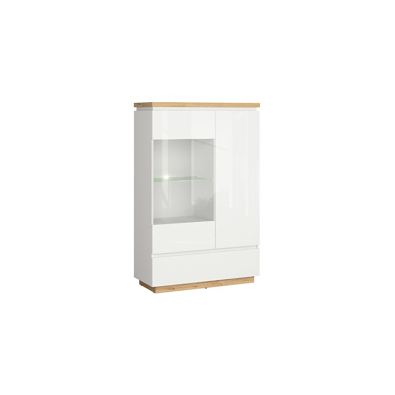 - Gładkie, bezuchwytowe fronty podkreślają nowoczesny charakter witryny do salonu.