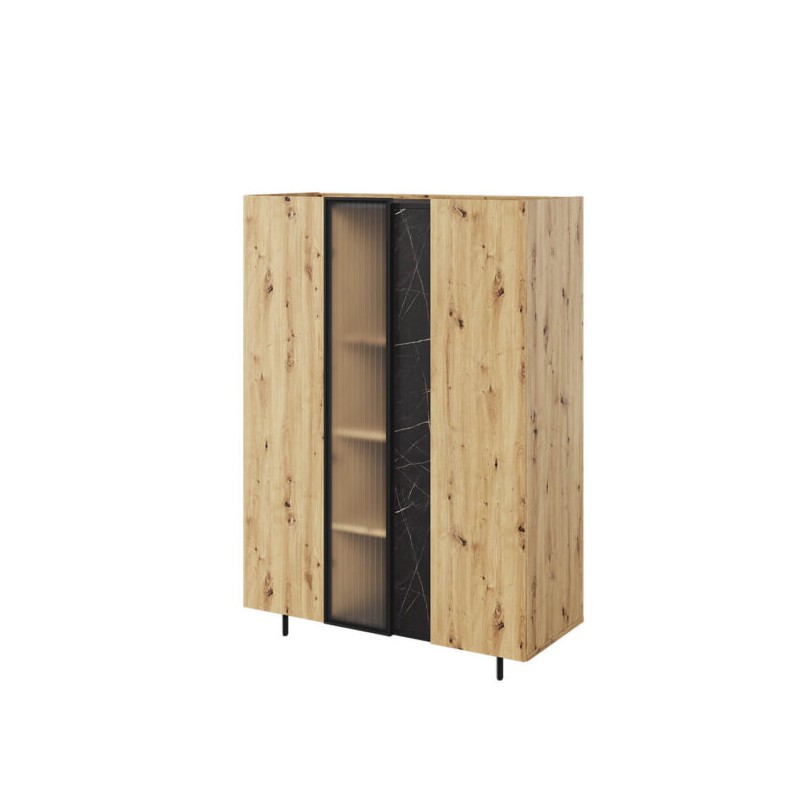 Salon jest niezwykle istotnym miejscem w każdym domu, pełniącym rolę centrum życia, gdzie odpoczywamy i przyjmujemy gości. Dlatego ważne jest, aby urządzić go nie tylko modnie, ale przede wszystkim funkcjonalnie. Kolekcja MARMO jest dedykowana dla osób ceniących nietypowe połączenia i oryginalny charakter. Szafka stojąca do salonu z pewnością ułatwi utrzymanie porządku w dokumentach i przedmiotach codziennego użytku. Elementy stylistyczne, takie jak dekor w ciepłym odcieniu drewna, czarna płyta z marmurowym wzorem oraz ozdobne szkło master ligne, współgrają ze sobą, tworząc harmonijną aranżację o nowoczesnej elegancji. Czarne akcenty dodają wyrazistości, a smukłe nóżki nadają meblowi niezwykłą lekkość. Warto również zwrócić uwagę na oświetlenie w komplecie, które wprowadza przyjemny nastrój do wnętrza i subtelnie podkreśla dekoracje za przeszklonymi drzwiczkami. Ta nowoczesna szafka z kolekcji MARMO jest idealna dla miłośników designerskich wnętrz, oferując wyjątkowy styl i funkcjonalność.