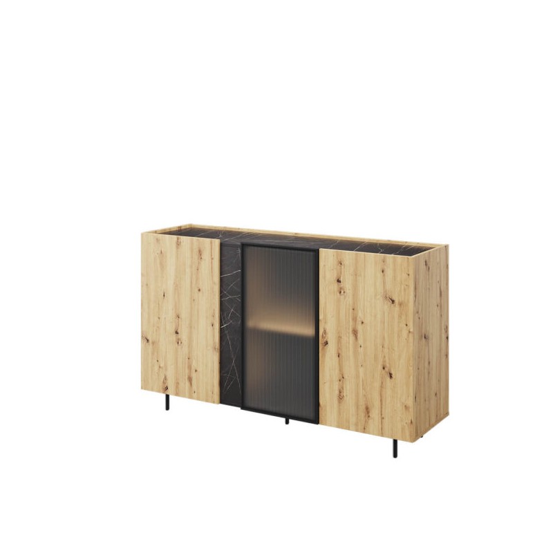Trzydrzwiowa komoda o długości 150 cm to praktyczne rozwiązanie, które oferuje dużą pojemność na przechowywanie dokumentów i różnego rodzaju akcesoriów. Wnętrze komody jest wyposażone w przestronne półki, które ułatwiają utrzymanie porządku. Komoda została zaprojektowana z obniżonym blatem, który chroni wyeksponowane przedmioty przed upadkiem. Jej oryginalny design przyciąga uwagę. Bezuchwytowe fronty podkreślają uczucie porządku, a system soft close zapewnia łagodne domykanie. Wyrazisty wzór imitujący marmur świetnie komponuje się z dekoracją w ciepłym odcieniu drewna. Nowoczesny styl mebla jest podkreślony przez modne, smukłe nóżki, czarne akcenty oraz ozdobne szkło master ligne. Klasyczna funkcjonalność tej komody sprawia, że doskonale sprawdzi się w różnych pomieszczeniach, takich jak salon, sypialnia, garderoba, przedpokój czy małe studio. Komoda na nóżkach świetnie prezentuje się samodzielnie lub w połączeniu z innymi meblami z kolekcji MARMO, na przykład półkami lub szafkami RTV.