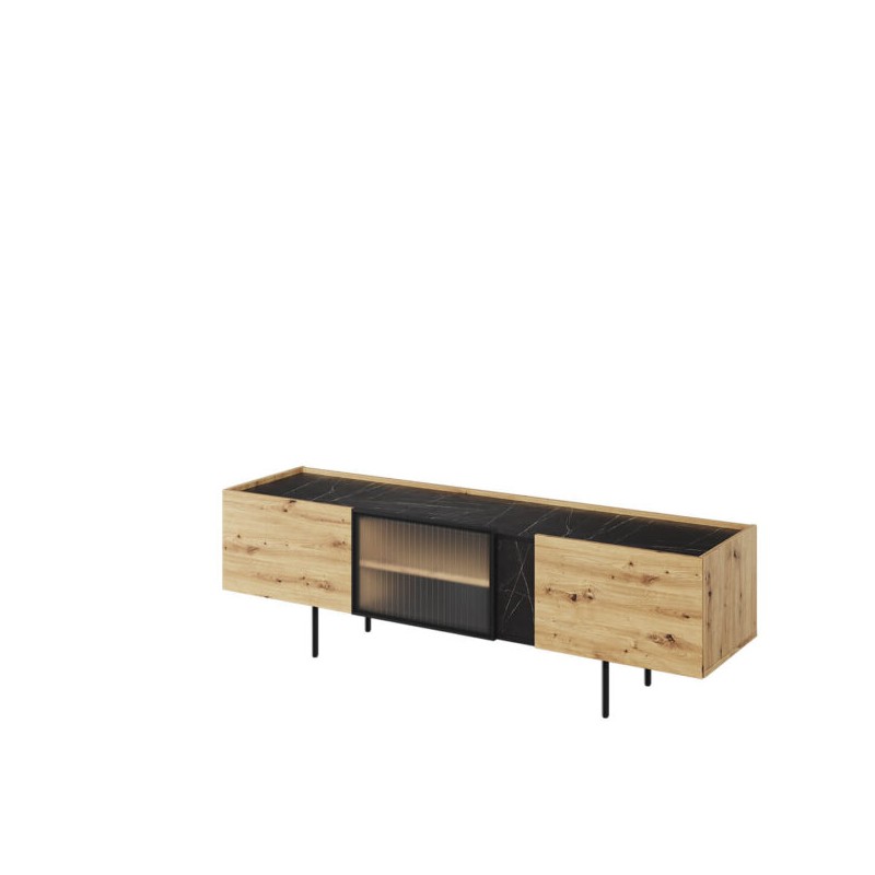 Dobrze zorganizowana strefa rozrywki to niezwykle przydatny element w niemal każdym domu. Szafka RTV z kolekcji MARMO nie tylko prezentuje się świetnie, ale również oferuje dużą funkcjonalność. Mebel jest podparty na smukłych, zaokrąglonych nóżkach, które dodają mu lekkości i elegancji. Obniżony blat pełni zarówno rolę dekoracyjną, jak i funkcjonalną, zapewniając bezpieczeństwo dla wyeksponowanych przedmiotów. Wyjątkowy charakter szafki wynika z połączenia wzoru imitującego marmur z ciepłym odcieniem drewna, a efekt ten jest uzupełniony przez ozdobne szkło master ligne. Elegancka szafka RTV została wyposażona w trzy pojemne szafki, idealne do przechowywania kolekcji płyt, pilotów, padów i innych drobiazgów związanych z salonową rozrywką. Wybór mebli pod telewizor jest obecnie szeroki, ale jeśli marzysz o wnętrzu o niepowtarzalnym charakterze, kolekcja MARMO jest stworzona właśnie dla Ciebie!