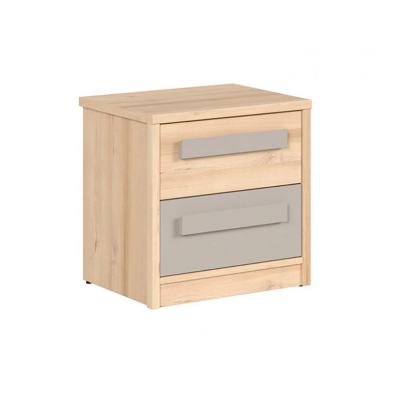 Wykorzystaj proste kształty i neutralną kolorystykę kolekcji Namek i stwórz swojemu dziecku nowoczesny i funkcjonalny pokój. Praktyczna towarzyszka łóżka? Szafka nocna Namek to nieodłączny element każdej sypialni, który ułatwi poranki. Do dyspozycji masz 2 kompaktowe szuflady, w których możesz schować podręczne artykuły. Połączenie korpusu w wybarwieniu buk iconic oraz frontu dolnej szuflady w kolorze szary jasny jest doskonałą bazą dla aranżacji pokoju dziecka. Za poręczne uchwyty służy prosta listwa w kolorze szary jasny.