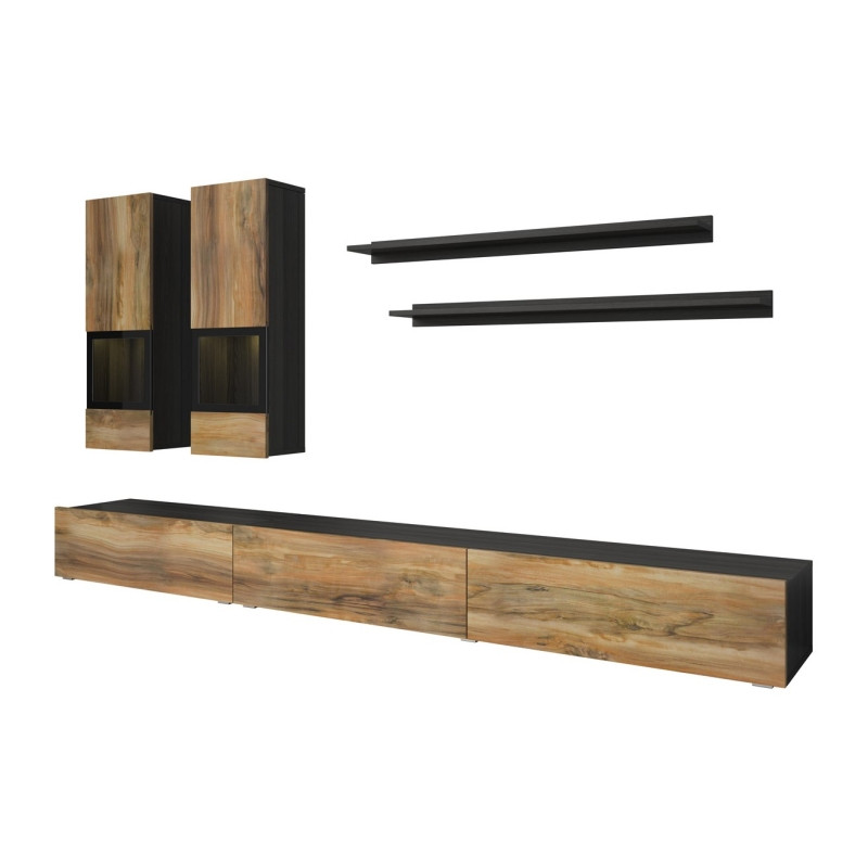 - zestaw: komoda RTV, 2 szafki wiszące, 2 półki ścienne