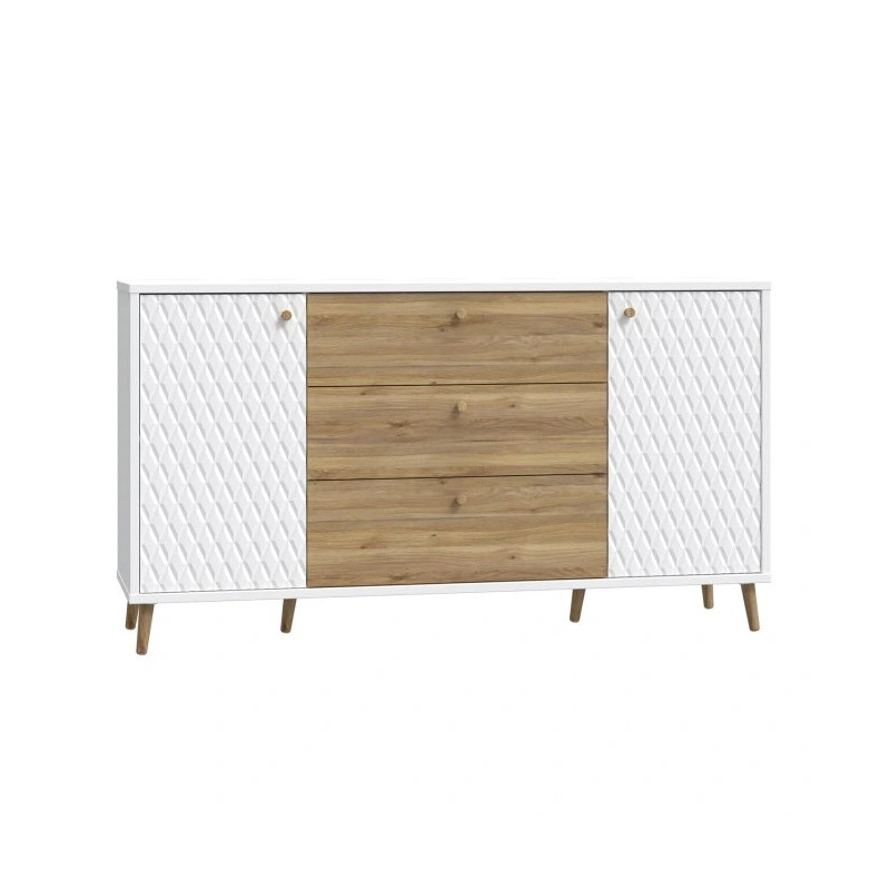 Komoda ryflowana AKSANA 159,2 cm Biały/Dąb Mauvella to stylowy i praktyczny mebel, który doskonale odnajdzie się w nowoczesnych wnętrzach. Dzięki połączeniu ryflowanych frontów z eleganckimi dekorami w kolorach Białym i Dąb Mauvella, komoda przyciąga wzrok i podkreśla wyjątkowy charakter pomieszczenia. Wysokie drewniane nóżki dodają jej wizualnej lekkości, a także ułatwiają utrzymanie porządku pod meblem.