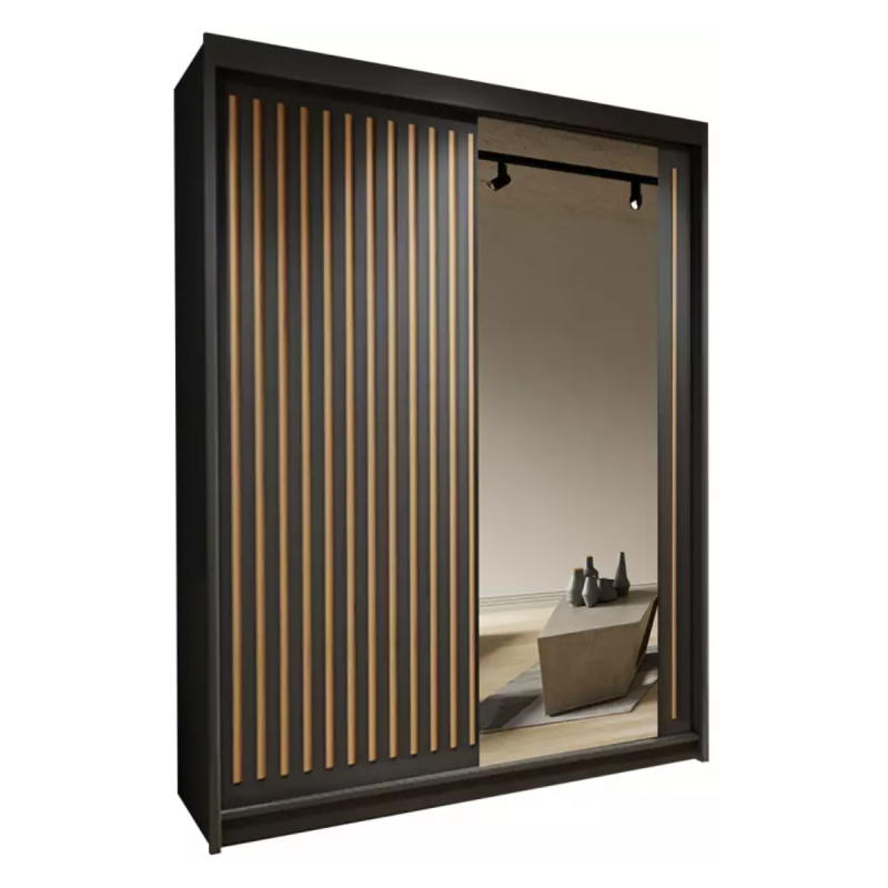 Na frontach umieszczono lustro, które optycznie powiększa przestrzeń, dodaje więcej światła do wnętrza i pozytywnie wpływa na korzystanie z szafy. Dodatkowo fronty ozdobione są dekoracyjnymi lamelami, które nadają całości nowoczesny, elegancki wygląd i stanowią subtelny element ozdobny.