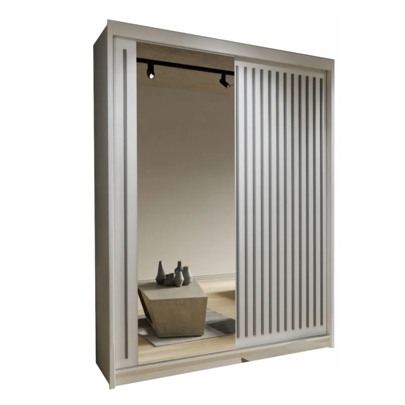 Na frontach umieszczono lustro, które optycznie powiększa przestrzeń, dodaje więcej światła do wnętrza i pozytywnie wpływa na korzystanie z szafy. Dodatkowo fronty ozdobione są dekoracyjnymi lamelami, które nadają całości nowoczesny, elegancki wygląd i stanowią subtelny element ozdobny.