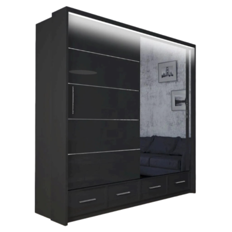 Dla jeszcze większej wygody i nowoczesnego stylu szafa Onyx posiada drzwi przesuwne, co sprawia, że jest idealnym rozwiązaniem nawet do mniejszych pomieszczeń. W zestawie dostępna jest także nadstawka oraz oświetlenie LED, które dodaje wnętrzu niepowtarzalnego klimatu i ułatwia codzienne użytkowanie.