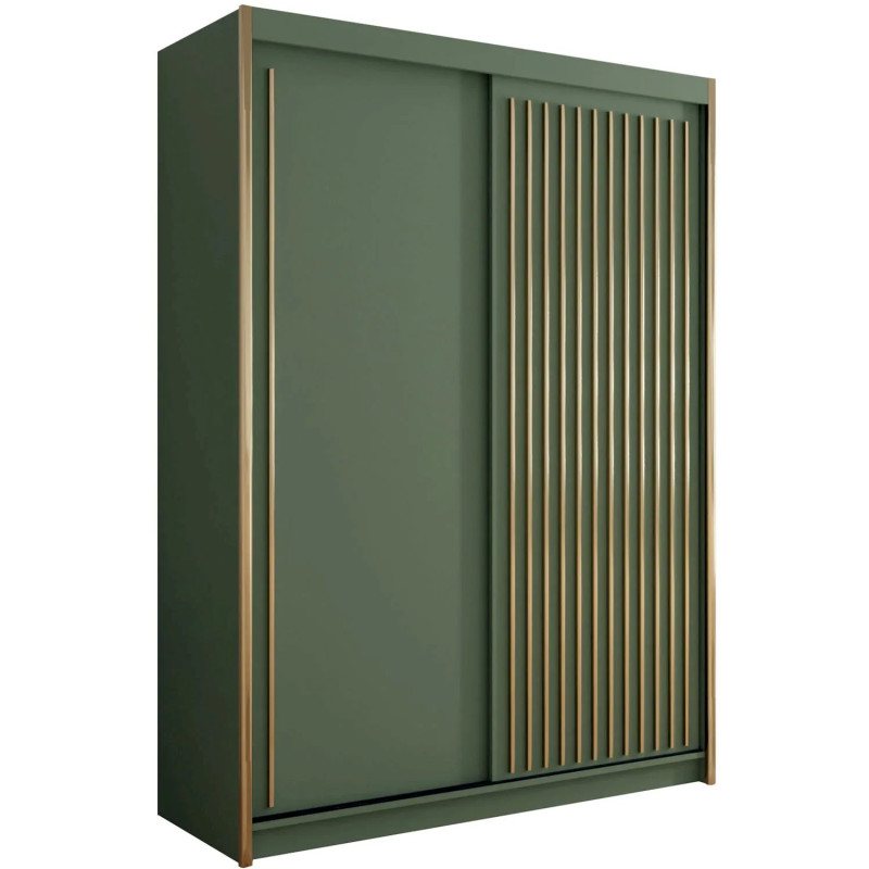 Korpus szafy w intensywnym zielonym kolorze dodaje świeżości i charakteru każdemu wnętrzu, tworząc odważny kontrast z eleganckim frontem. Fronty szafy są w tym samym zielonym odcieniu, wzbogacone o eleganckie złote lamelki.