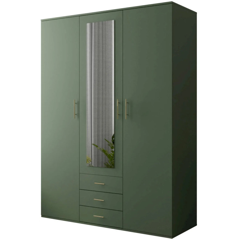 Szafa Closy o szerokości 150 cm to elegancki i funkcjonalny mebel, który doskonale wpasuje się w nowoczesne wnętrza. Wykonana z wysokiej jakości płyty meblowej w kolorze zielonym, charakteryzuje się solidną konstrukcją i dbałością o detale. Fronty szafy zdobią lustra, które optycznie powiększają przestrzeń, a złote uchwyty dodają jej wyrafinowanego charakteru.