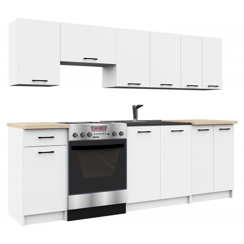 Szafki kuchenne z serii Oliwia to tanie rozwiązanie na zagospodarowanie przestrzeni w kuchni. Klasyczny wygląd i niska cena idealnie pasuje do wystroju wnętrza każdego mieszkania. System składa się z wielu szafek aby zabudować dowolną kuchnię. Biała nowoczesna kuchnia Oliwia z czarnymi uchwytami. Prostota i minimalizm w stylu skandynawskim. Kuchnia wpisuje się w najnowsze trendy kolorystyczne i zapewnia dużą swobodę dzięki ustawnym szafką.