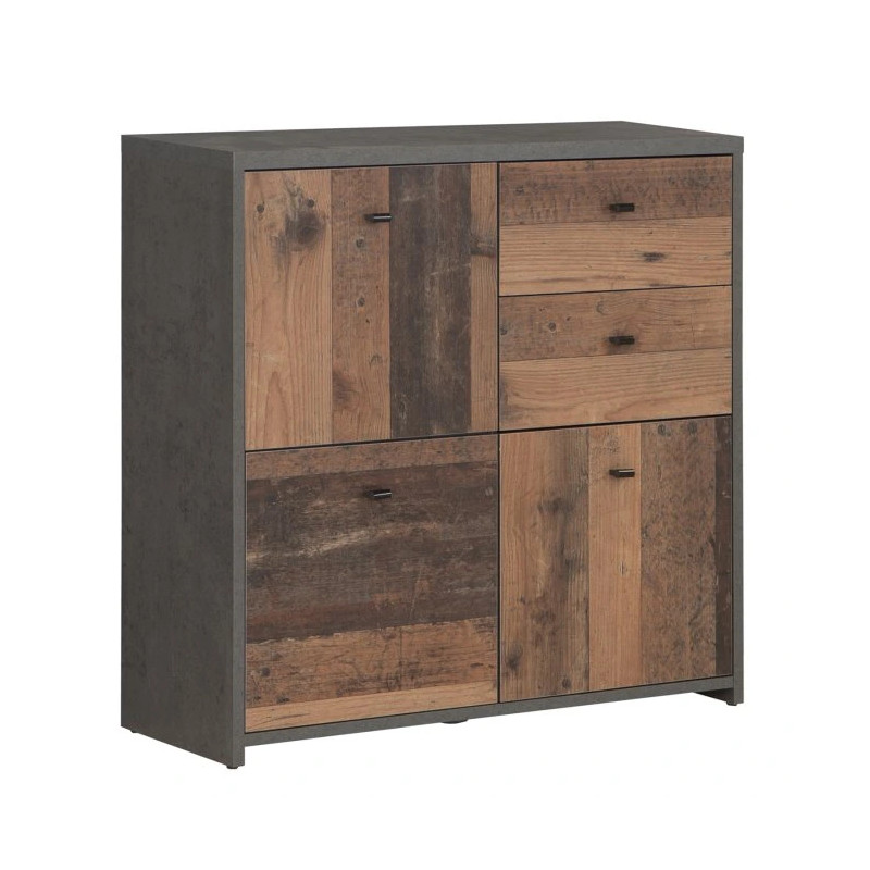 Nowoczesna komoda szeroka z kolekcji Beton Ciemnoszary/Old Wood Vintage to doskonałe rozwiązanie dla osób ceniących industrialny styl i praktyczne meble. Szerokość 77 cm sprawia, że komoda mieści się w różnych przestrzeniach, oferując trzy pojemne szafki oraz dwie szuflady na najpotrzebniejsze rzeczy. Kontrast pomiędzy surowym betonem a dekorem Old Wood Vintage tworzy efektowny, loftowy charakter, który świetnie odnajduje się w nowoczesnych i minimalistycznych aranżacjach. Mebel doskonale komponuje się z pozostałymi elementami kolekcji, tworząc spójny i wyrazisty wystrój wnętrza.