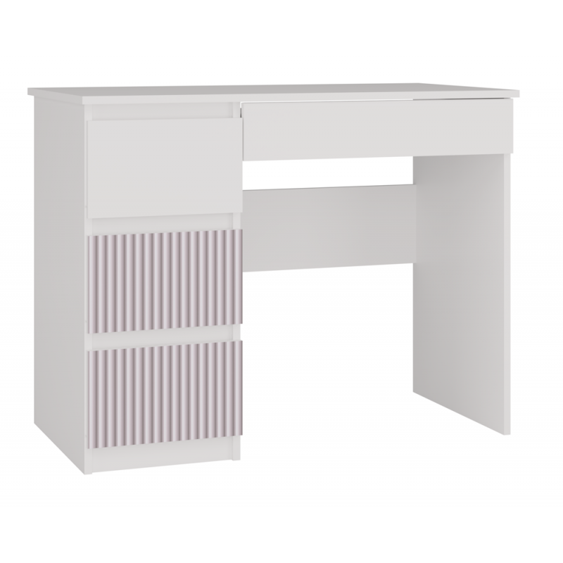 - 3 pojemne wysokie szuflady z lewej strony (w tym 2 szuflady z różowymi wzorami) i 1 niska z prawej strony pod blatem