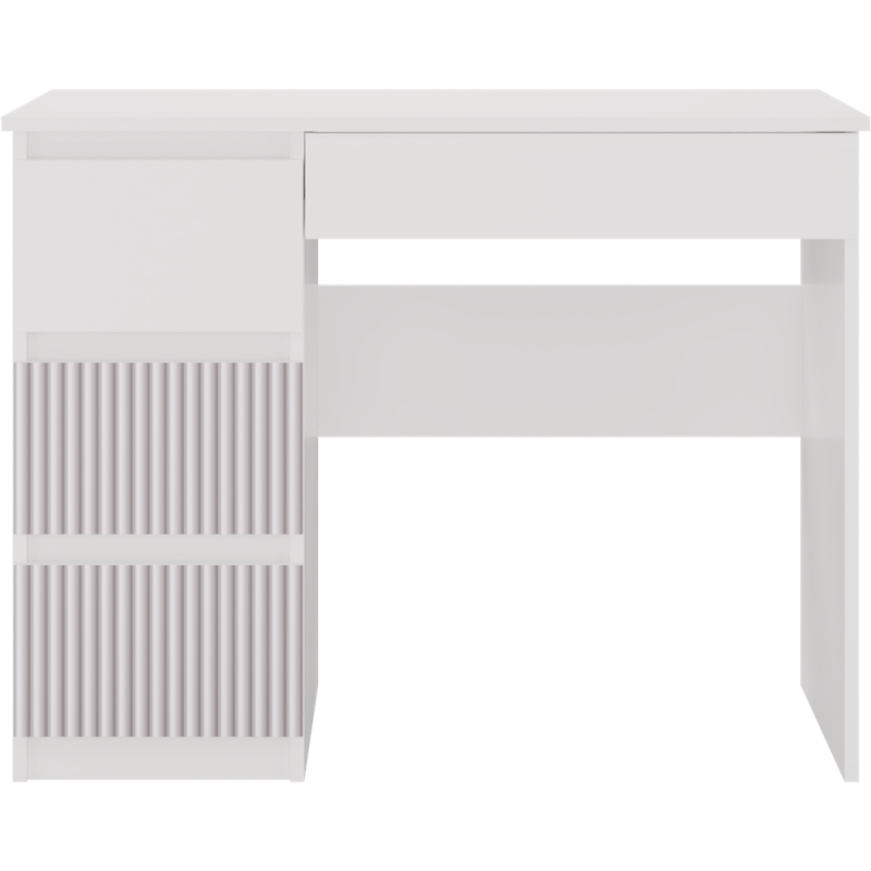 - 3 pojemne wysokie szuflady z lewej strony (w tym 2 szuflady z różowymi wzorami) i 1 niska z prawej strony pod blatem