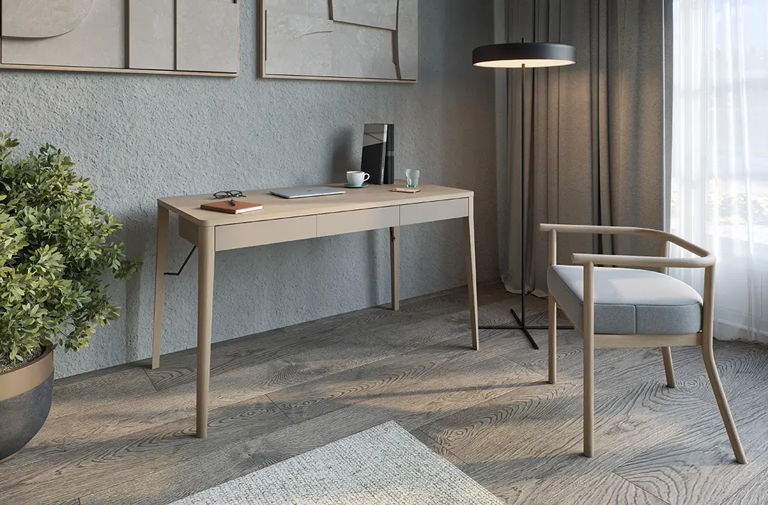Match MK-01 to połączenie nowoczesnej formy z wysoką jakością wykonania. Blat oraz fronty zostały wykonane z trwałej płyty wiórowej laminowanej, co gwarantuje wytrzymałość i odporność na codzienne użytkowanie. Jasny odcień dębu w połączeniu z beżowymi akcentami tworzy ciepły, przyjazny wygląd, który wprowadza do wnętrza naturalny i minimalistyczny charakter. Praktyczne szuflady nie tylko ułatwiają organizację, ale również dodają meblowi funkcjonalności, czyniąc go idealnym miejscem do codziennej pracy.
