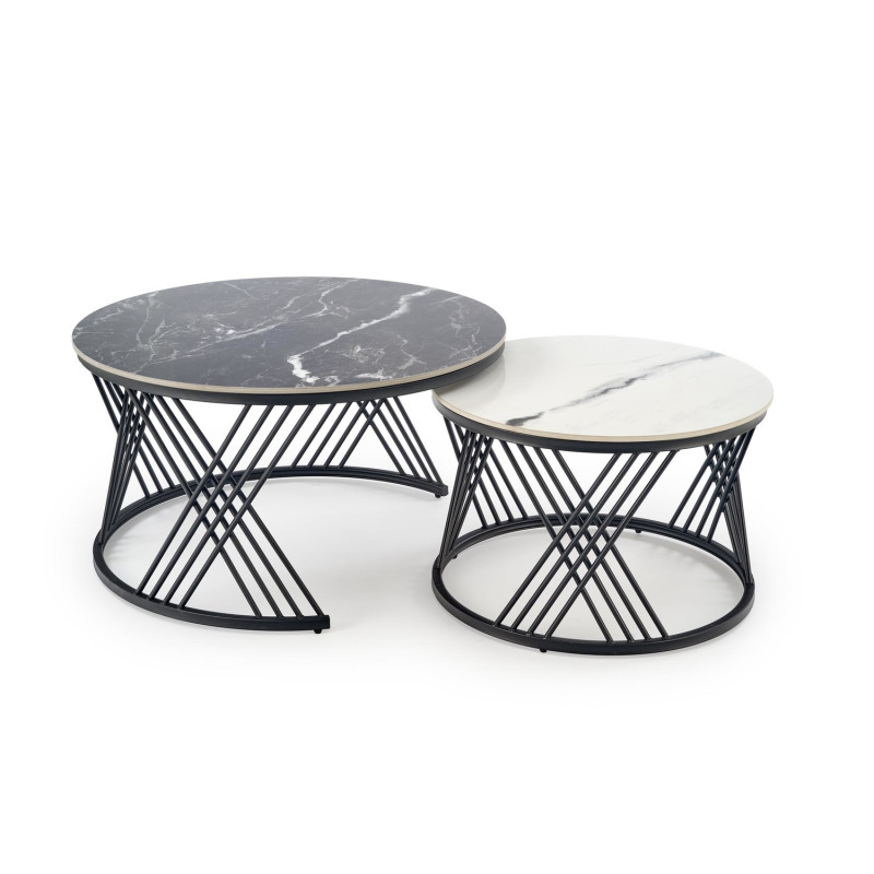 Zestaw ław Flamigo to wyjątkowa propozycja do nowoczesnych salonów, w których liczy się styl, elegancja i funkcjonalność. Dwie ławy o okrągłych blatach różnej wielkości tworzą spójną, a jednocześnie dynamiczną kompozycję, idealną do aranżacji przestrzeni wypoczynkowej. Połączenie czarnego marmuru z białym marmurem nadaje całości luksusowego charakteru, a czarny metalowy stelaż podkreśla nowoczesny styl zestawu.
