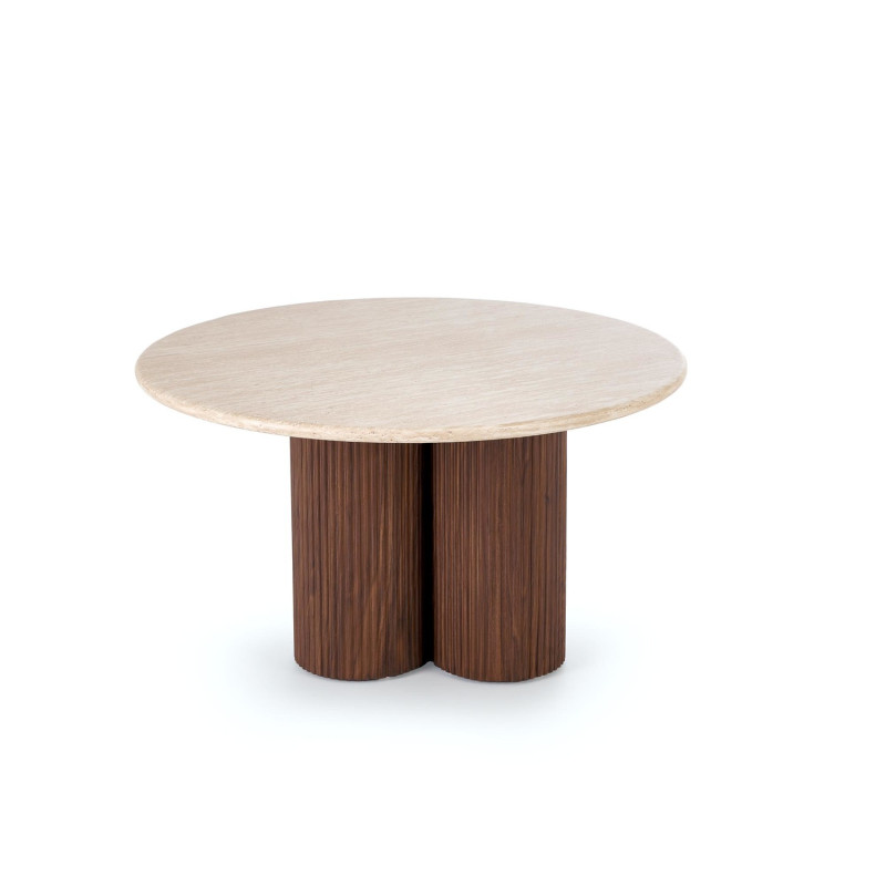 Ława Doroteo to stylowy mebel o nowoczesnej formie, który doskonale wpisuje się w aktualne trendy wnętrzarskie inspirowane naturą. Okrągły blat w kolorze trawertynu w połączeniu z ciepłym odcieniem orzecha tworzy harmonijną i elegancką kompozycję, idealną do salonu lub strefy wypoczynkowej. Matowe wykończenie podkreśla subtelny, wyrafinowany charakter ławy.