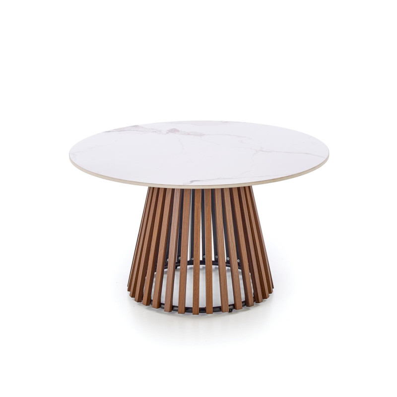 Ława Carino to elegancki mebel o nowoczesnej formie, który łączy naturalne ciepło drewna z luksusowym wyglądem kamienia. Okrągły blat w wykończeniu beżowego marmuru nadaje wnętrzu lekkości i subtelnej elegancji, a orzechowa podstawa wprowadza przytulny, harmonijny akcent. Model doskonale sprawdzi się w salonach urządzonych w stylu nowoczesnym, japandi lub soft loft.