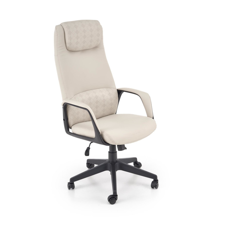 Fotel tapicerowany jest elegancką i łatwą w pielęgnacji eco skórą w beżowym kolorze, która nadaje mu profesjonalny, uniwersalny wygląd. Stabilna podstawa z polipropylenu oraz kauczukowe kółka gwarantują płynne i ciche przemieszczanie się po różnych powierzchniach. Konstrukcja przystosowana jest do maksymalnego obciążenia 120 kg.