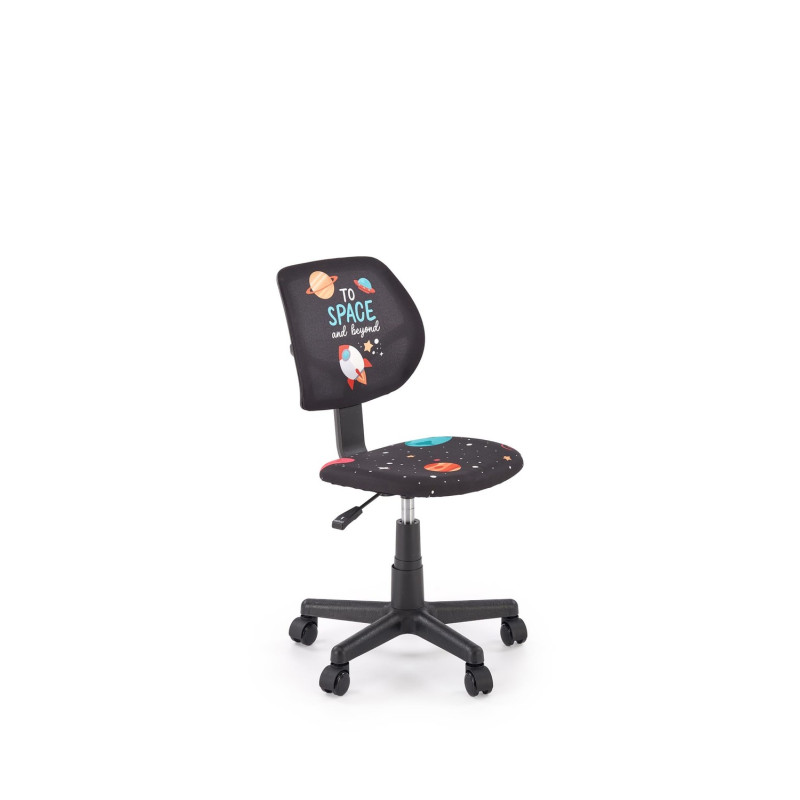 Siedzisko wykonane jest z wytrzymałej tkaniny, która zapewnia komfort siedzenia, a stabilna podstawa z polipropylenu gwarantuje bezpieczeństwo i lekkość konstrukcji. Fotel wyposażono w podstawowy mechanizm umożliwiający regulację wysokości siedziska, co pozwala dopasować go do wzrostu dziecka. Klasyczne kółka umożliwiają swobodne przemieszczanie się po podłodze. Model przeznaczony jest do maksymalnego obciążenia 80 kg.
