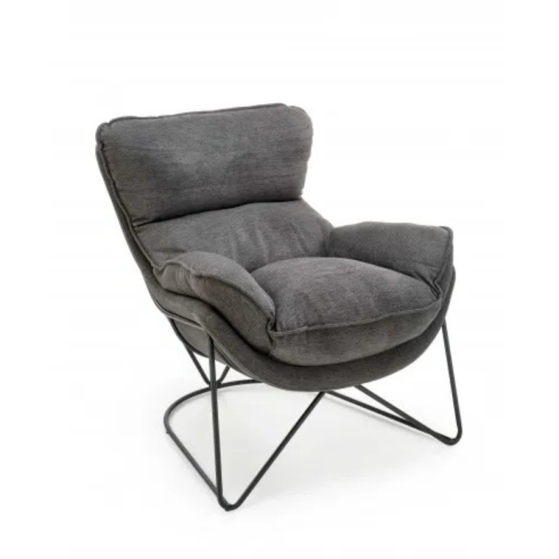 Nogi i stelaż wykonane z czarnego metalu dodają fotelowi nowoczesnego charakteru. To mebel, który doskonale łączy w sobie elementy metalu i tkaniny, tworząc spójną całość.