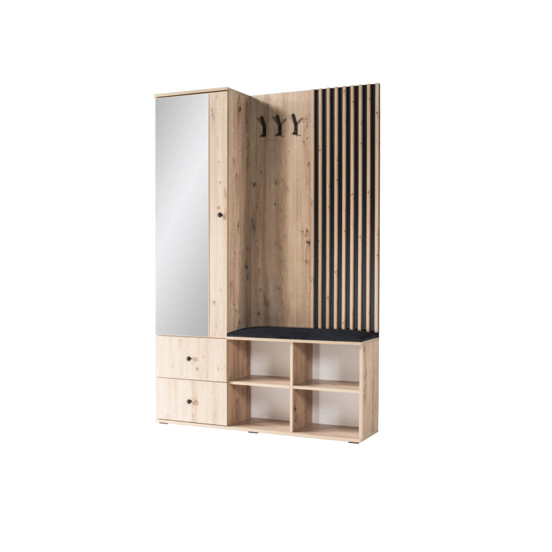 Garderoba z siedziskiem CALI od producenta Jarstol to nowoczesny i funkcjonalny mebel, który doskonale wkomponuje się w wystrój każdego przedpokoju. Wykonana z wysokiej jakości laminowanej płyty meblowej w kolorze dąb artisan, z dodatkiem czarnych matowych elementów oraz ozdobnych lameli, nadaje wnętrzu elegancki i przytulny charakter.