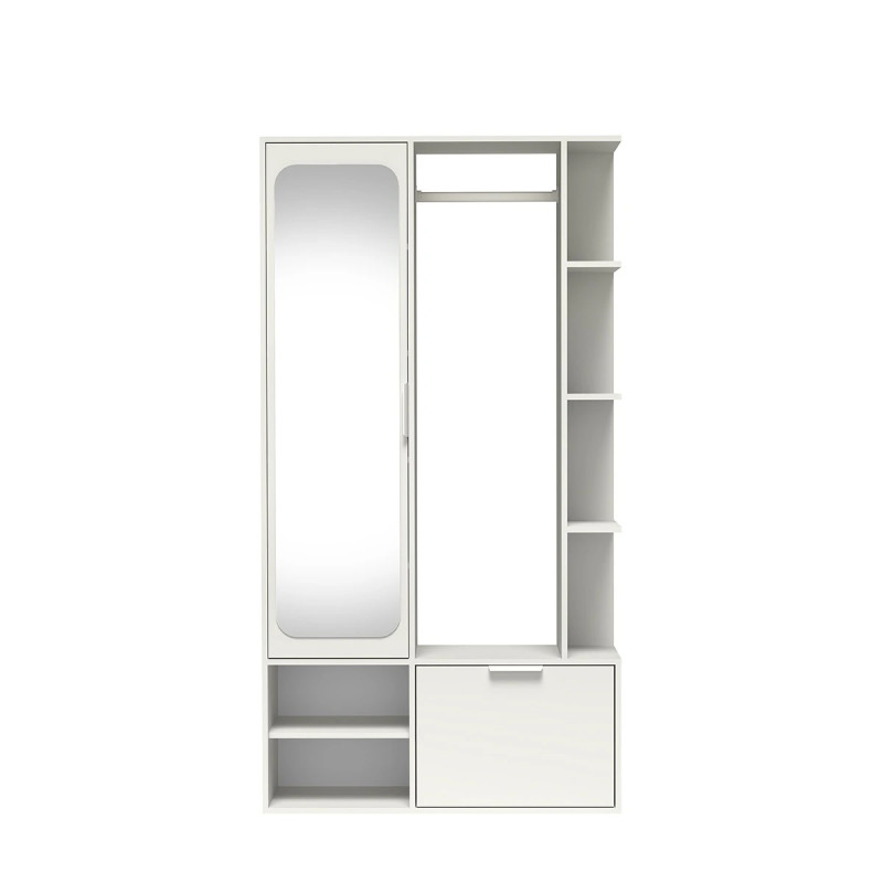 Garderoba NALA w kolorze białym alpejskim to praktyczny i estetyczny mebel do przedpokoju, który pomaga uporządkować codzienne akcesoria i odzież wierzchnią. Dzięki przemyślanej konstrukcji łączy w sobie funkcję przechowywania, organizacji oraz wygodnego przygotowania się do wyjścia z domu. Duże lustro optycznie rozjaśnia przestrzeń i sprawia, że wnętrze wydaje się bardziej przestronne, a jednocześnie pozwala na szybkie sprawdzenie stylizacji przed wyjściem.