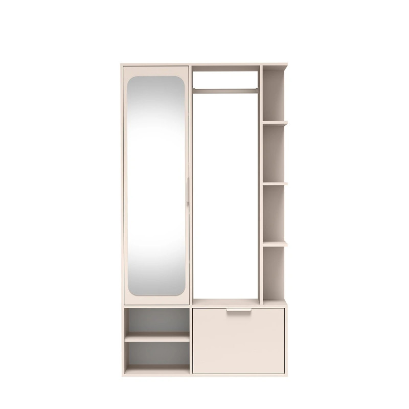 Garderoba NALA w kolorze kaszmir to eleganckie i funkcjonalne rozwiązanie do przedpokoju, stworzone z myślą o wygodnej organizacji codziennych rzeczy. Mebel łączy nowoczesną estetykę z praktycznym układem, dzięki czemu ułatwia przechowywanie odzieży wierzchniej, obuwia i dodatków, a przy tym wprowadza do wnętrza przytulny, uporządkowany charakter.