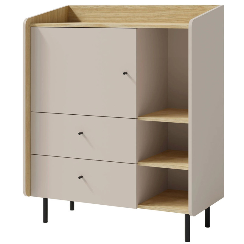 Komoda z kolekcji Alessio w kolorze beż piaskowy/dąb olejowany to nowoczesny i funkcjonalny mebel, idealnie pasujący do pokoju nastolatka. Wyposażona w dwie szuflady, jedne drzwi oraz dwie otwarte półki, oferuje mnóstwo miejsca do przechowywania zarówno ubrań, jak i codziennych przedmiotów czy dekoracji. Jej przemyślany układ ułatwia organizację przestrzeni, pomagając w utrzymaniu porządku w młodzieżowym wnętrzu.