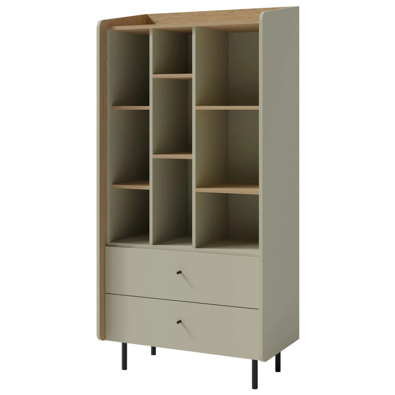 Regał z kolekcji Alessio w kolorze eukaliptus + Dąb Baltic Dune to stylowy i funkcjonalny mebel, stworzony z myślą o pokojach nastolatków. Wyposażony w dwie pojemne szuflady oraz otwarte wnęki, regał oferuje mnóstwo miejsca do przechowywania i eksponowania książek, dekoracji czy szkolnych akcesoriów. Dzięki otwartym półkom wszystkie najważniejsze przedmioty są zawsze pod ręką, a dwie szuflady pozwalają na uporządkowanie drobniejszych rzeczy.
