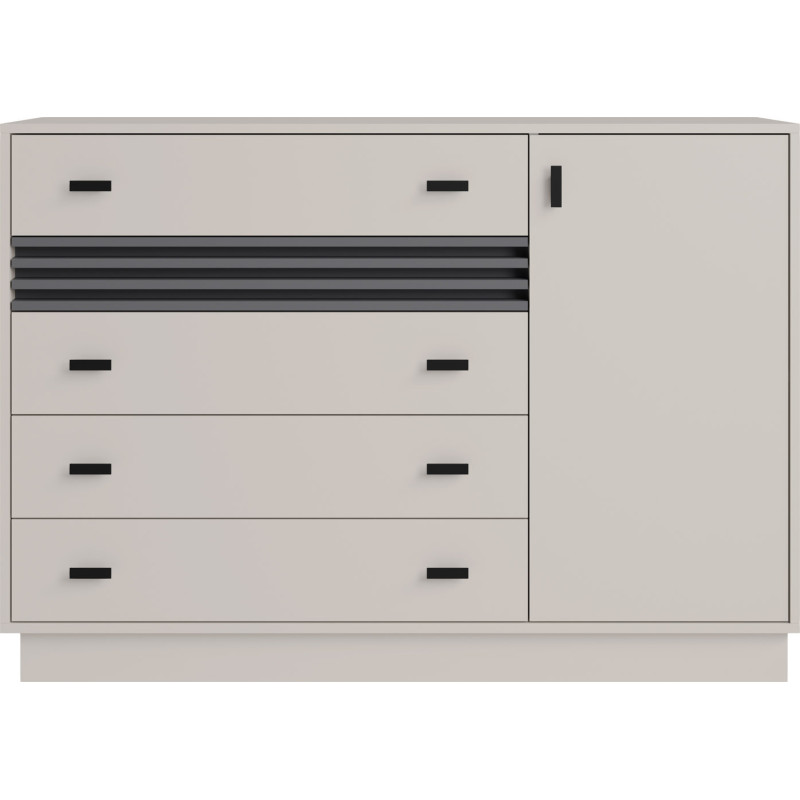 Komoda Allmo Kaszmir + Antracyt to elegancki i funkcjonalny mebel, który idealnie dopełni aranżację salonu, sypialni czy pokoju młodzieżowego. Jej nowoczesny charakter podkreśla kontrastowe połączenie jasnego kaszmiru z antracytowymi detalami, które wprowadzają do wnętrza styl i harmonię.