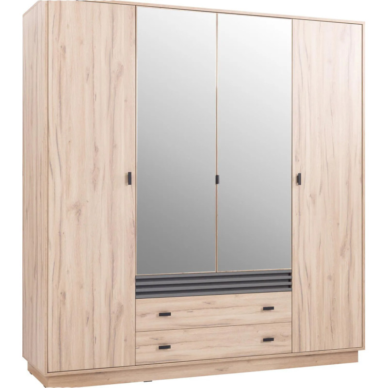 Czterodrzwiowa szafa z dwiema szufladami to elegancki i funkcjonalny mebel, który doskonale sprawdzi się w każdej sypialni czy garderobie. Wykonana z trwałych materiałów, szafa posiada stylową antracytową wstawkę, która nadaje nowoczesny charakter i wyróżnia się wśród innych mebli.