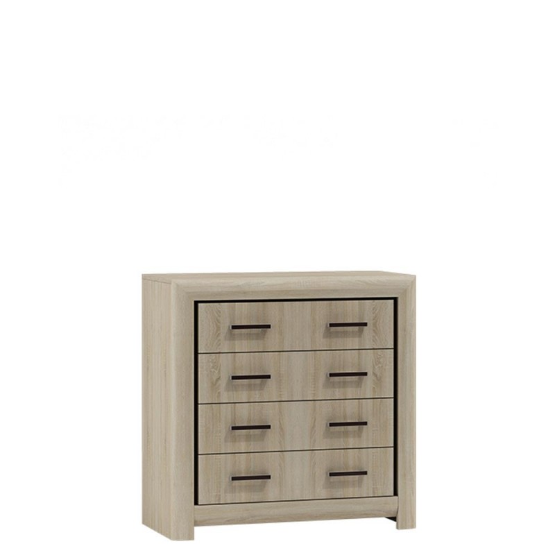 Komoda składa się z czterech szuflad. Uchwyty, wykonane z tworzywa sztucznego, są w czarnym, kontrastującym kolorze, który idealnie dopełnia kolorystykę mebla.