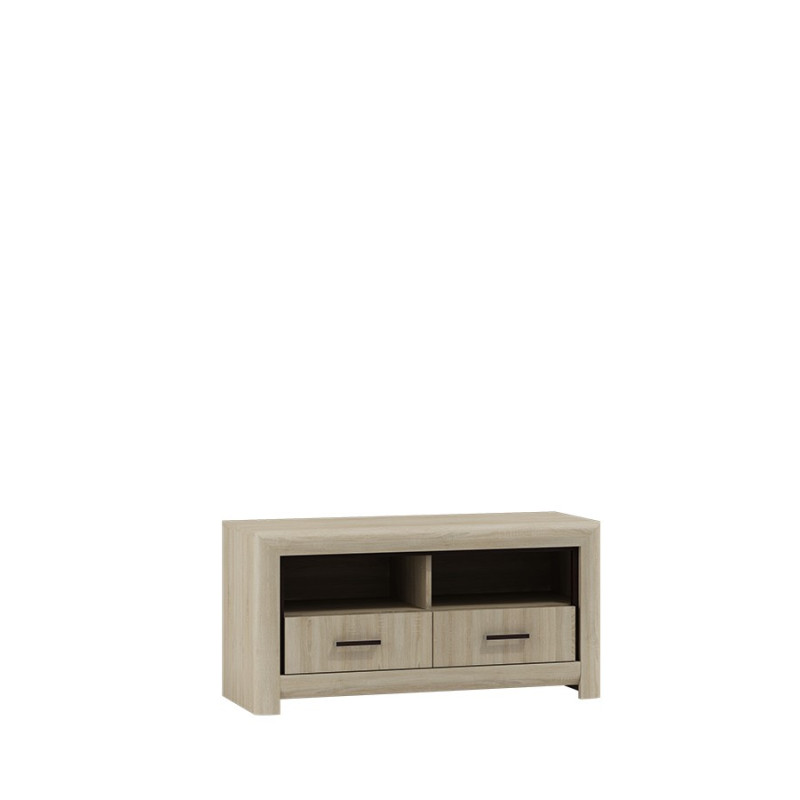 Szafka RTV składa się z dwóch szuflad oraz dwóch otwartych półek. Uchwyty wykonane z tworzywa sztucznego są w czarnym kontrastującym kolorze, który idealnie dopełnia kolorystykę mebla.