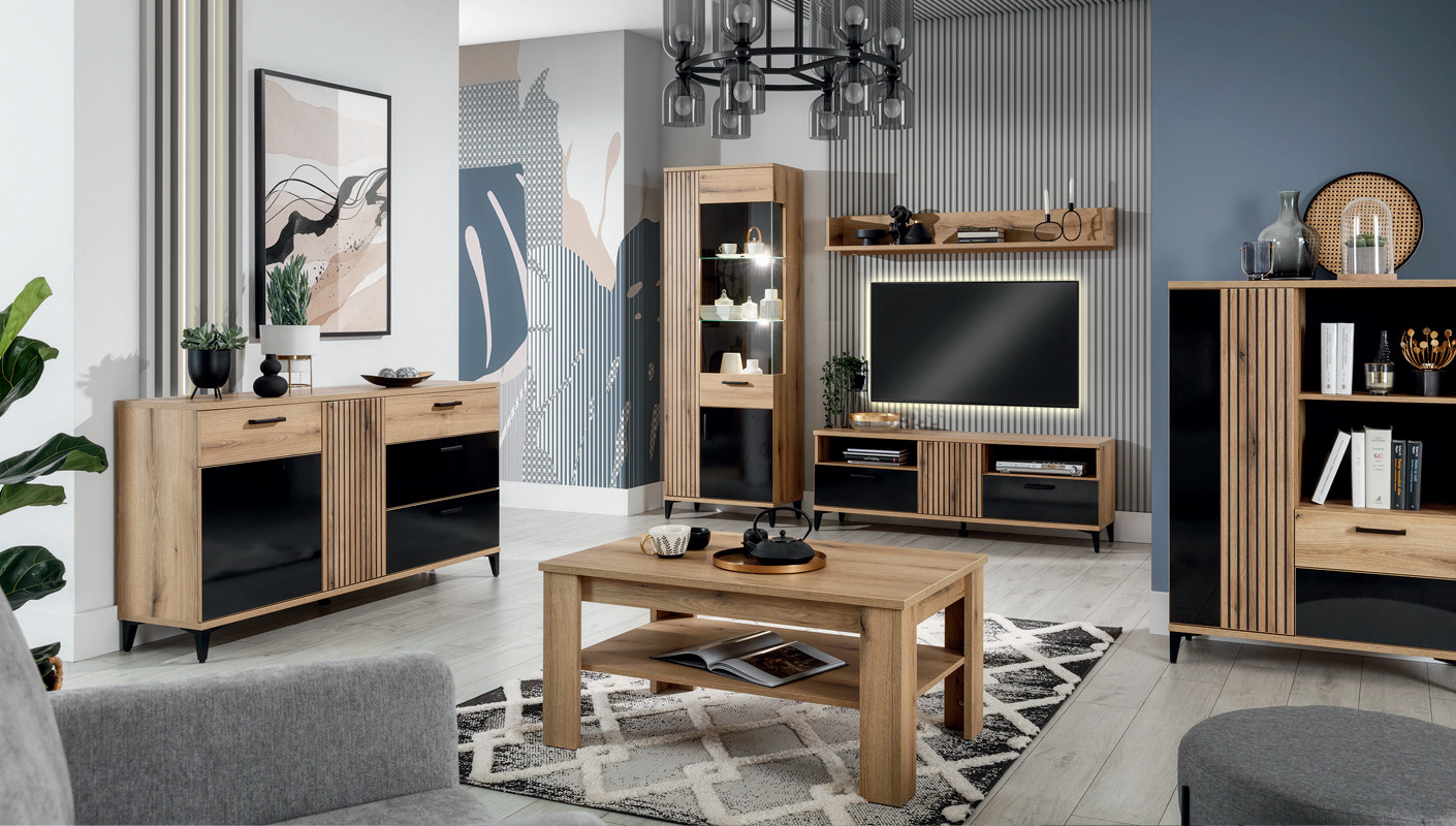 Kolorystyka mebla łączy elegancki odcień czarnego połysku z ciepłym, naturalnym akcentem dębu Evoke, tworząc harmonijną i nowoczesną całość. Ta subtelna kombinacja kolorów doskonale wpisuje się w różnorodne aranżacje wnętrz, nadając im przytulny i stylowy charakter.