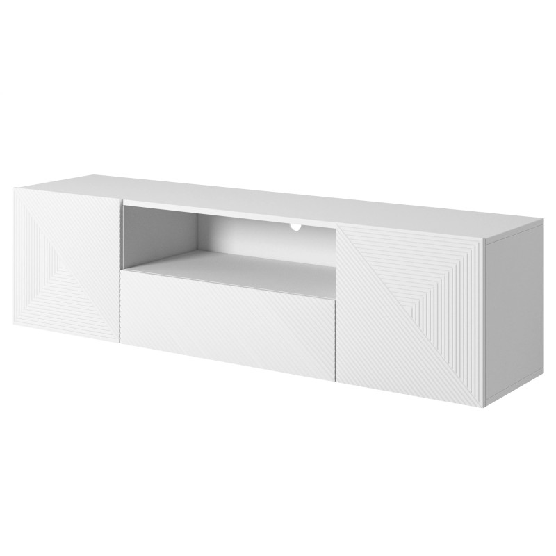 Mebel dostępny jest w klasycznej, eleganckiej kolorystyce – biel na korpusie oraz frontach, co pozwala na łatwe dopasowanie do różnych aranżacji wnętrz. Dzięki prostocie formy i geometrycznemu wzorowi na frontach, szafka RTV Asha stanowi doskonałe dopełnienie nowoczesnych, minimalistycznych wnętrz, a jej pojemne wnętrze pozwala na estetyczne przechowywanie i wyeksponowanie różnych przedmiotów. To doskonała propozycja dla osób ceniących połączenie designu, jakości i funkcjonalności w jednym.