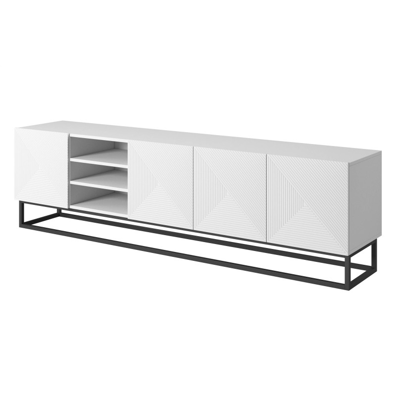 Szafka RTV Asha to mebel, który doskonale łączy nowoczesny design z funkcjonalnością, stając się idealnym wyborem do pokoju dziennego, jadalni czy sypialni. Wykonana z wysokiej jakości płyty laminowanej, z frontami z frezowanej płyty MDF, jest odporna na uszkodzenia i codzienne użytkowanie. Geometryczny wzór na froncie oraz elegancki, bezuchwytowy system otwierania to charakterystyczne cechy tej kolekcji, które nadają meblowi niepowtarzalny charakter. Całość osadzona jest na stalowym stelażu o wysokości 16 cm, co dodaje lekkości i nowoczesności.