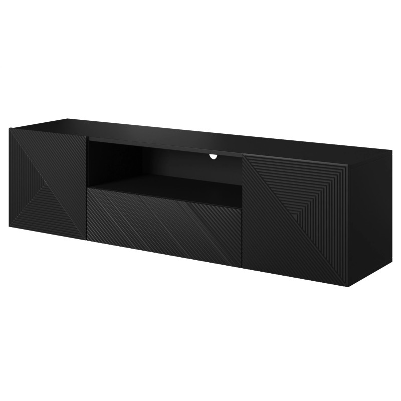 Mebel dostępny jest w klasycznej, eleganckiej kolorystyce – czarny mat na korpusie oraz frontach, co pozwala na łatwe dopasowanie do różnych aranżacji wnętrz. Dzięki prostocie formy i geometrycznemu wzorowi na frontach, szafka RTV Asha stanowi doskonałe dopełnienie nowoczesnych, minimalistycznych wnętrz, a jej pojemne wnętrze pozwala na estetyczne przechowywanie i wyeksponowanie różnych przedmiotów. To doskonała propozycja dla osób ceniących połączenie designu, jakości i funkcjonalności w jednym.