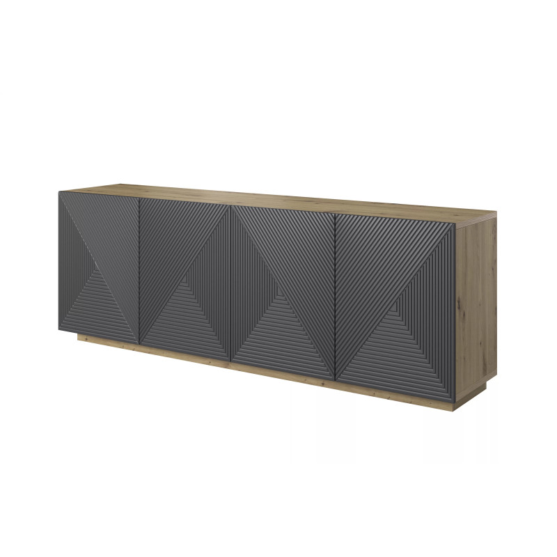 Komoda Asha to elegancka i funkcjonalna propozycja do nowoczesnych wnętrz, idealna do pokoju dziennego, sypialni czy jadalni. Dzięki zastosowaniu wysokiej jakości płyty laminowanej o grubości 16 mm oraz frezowanych frontów z płyty MDF, komoda łączy solidność z estetyką. Charakterystycznym akcentem jest geometryczny wzór na frontach, który wprowadza do wnętrza nowoczesny i subtelny charakter. Bezuchwytowy system otwierania oraz cichy domyk drzwi zapewniają wygodę użytkowania i komfort codziennego funkcjonowania.