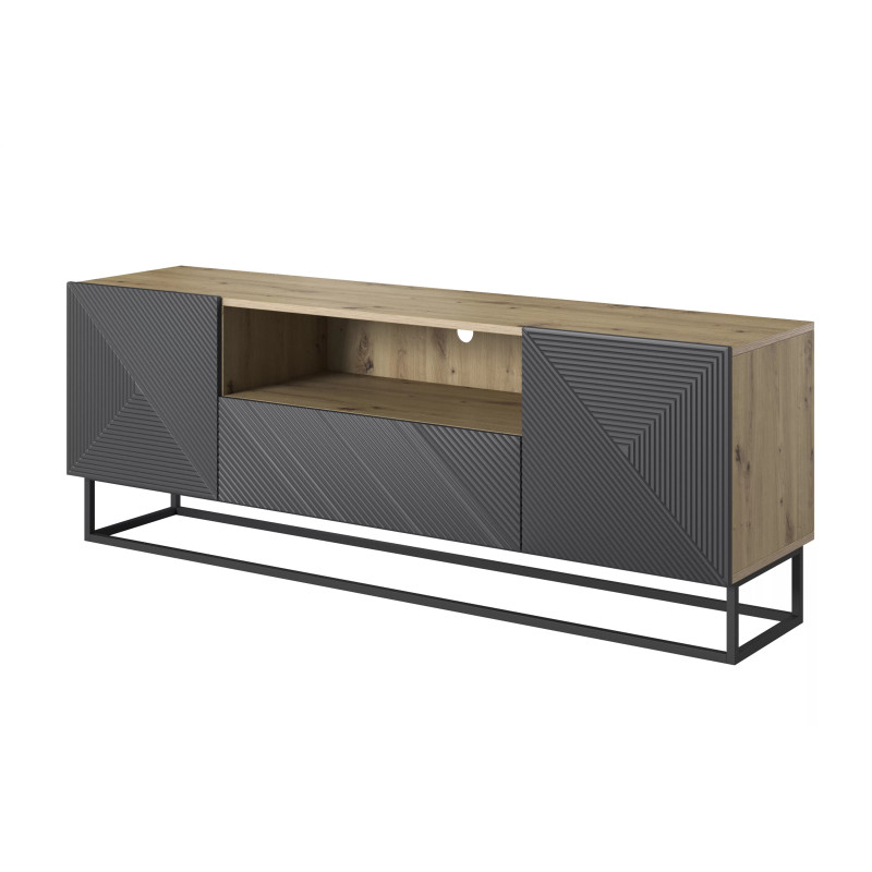 Szafka RTV Asha to mebel, który doskonale łączy nowoczesny design z funkcjonalnością, stając się idealnym wyborem do pokoju dziennego, jadalni czy sypialni. Wykonana z wysokiej jakości płyty laminowanej, z frontami z frezowanej płyty MDF, jest odporna na uszkodzenia i codzienne użytkowanie. Geometryczny wzór na froncie oraz elegancki, bezuchwytowy system otwierania to charakterystyczne cechy tej kolekcji, które nadają meblowi niepowtarzalny charakter. Całość osadzona jest na stalowym stelażu o wysokości 16 cm, co dodaje lekkości i nowoczesności.