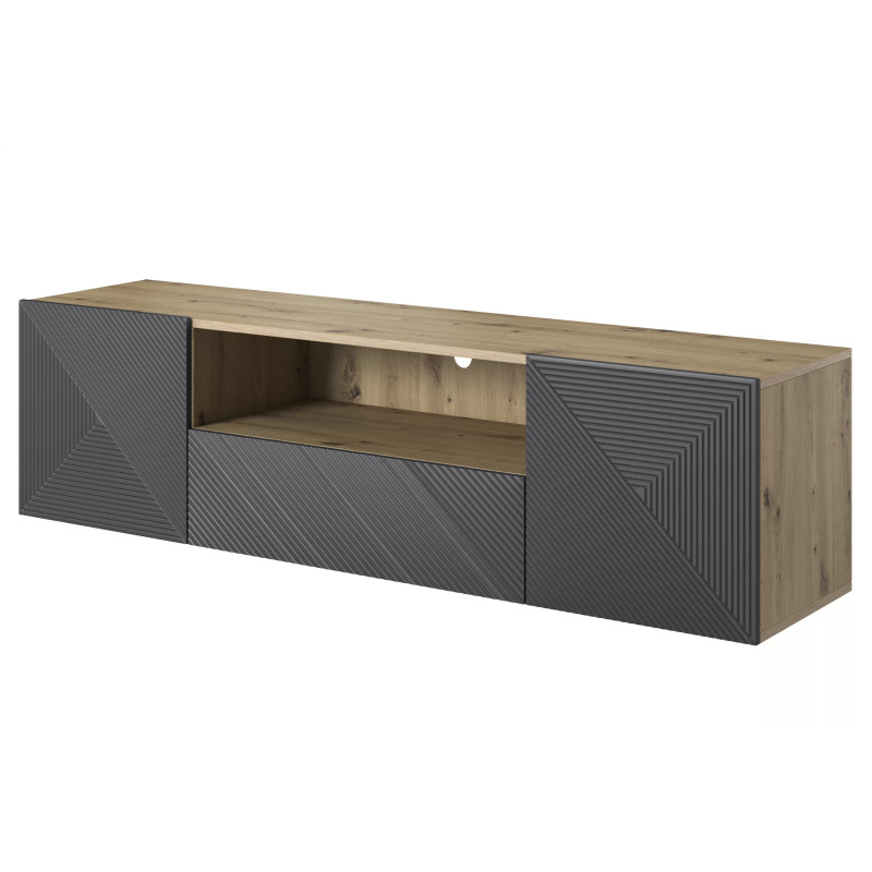 Szafka RTV Asha to mebel, który doskonale łączy nowoczesny design z funkcjonalnością, stając się idealnym wyborem do pokoju dziennego, jadalni czy sypialni. Wykonana z wysokiej jakości płyty laminowanej, z frontami z frezowanej płyty MDF, jest odporna na uszkodzenia i codzienne użytkowanie. Geometryczny wzór na froncie oraz elegancki, bezuchwytowy system otwierania to charakterystyczne cechy tej kolekcji, które nadają meblowi niepowtarzalny charakter.