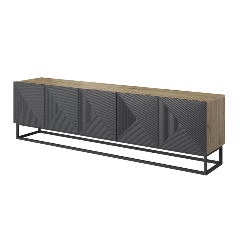 Szafka RTV Asha to mebel, który doskonale łączy nowoczesny design z funkcjonalnością, stając się idealnym wyborem do pokoju dziennego, jadalni czy sypialni. Wykonana z wysokiej jakości płyty laminowanej, z frontami z frezowanej płyty MDF, jest odporna na uszkodzenia i codzienne użytkowanie. Geometryczny wzór na froncie oraz elegancki, bezuchwytowy system otwierania to charakterystyczne cechy tej kolekcji, które nadają meblowi niepowtarzalny charakter. Całość osadzona jest na stalowym stelażu o wysokości 16 cm, co dodaje lekkości i nowoczesności.