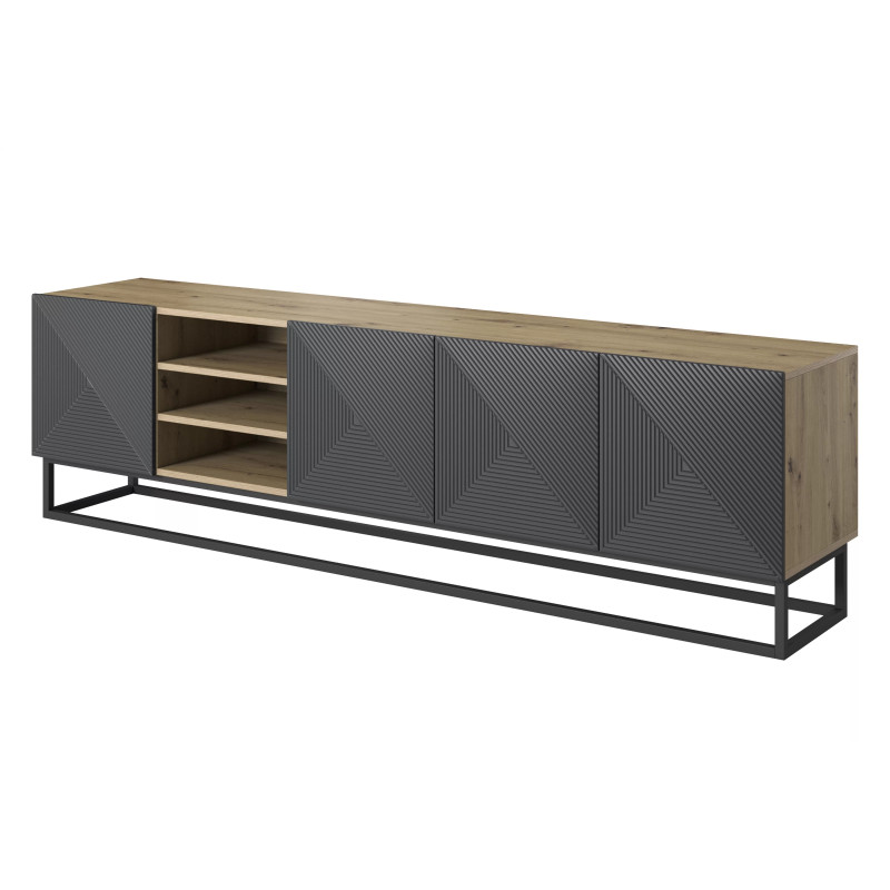 Szafka RTV Asha to mebel, który doskonale łączy nowoczesny design z funkcjonalnością, stając się idealnym wyborem do pokoju dziennego, jadalni czy sypialni. Wykonana z wysokiej jakości płyty laminowanej, z frontami z frezowanej płyty MDF, jest odporna na uszkodzenia i codzienne użytkowanie. Geometryczny wzór na froncie oraz elegancki, bezuchwytowy system otwierania to charakterystyczne cechy tej kolekcji, które nadają meblowi niepowtarzalny charakter. Całość osadzona jest na stalowym stelażu o wysokości 16 cm, co dodaje lekkości i nowoczesności.