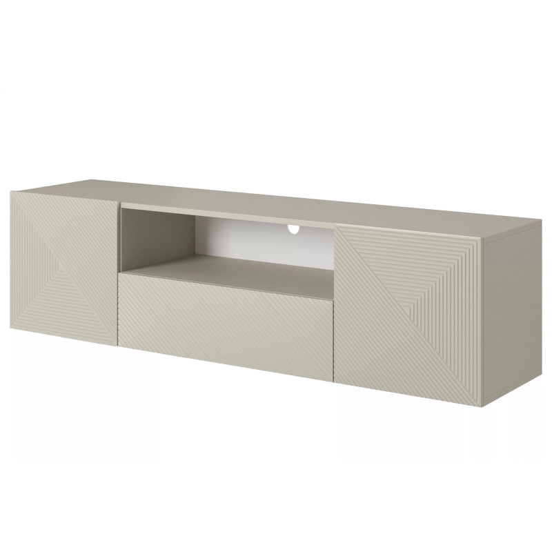 Mebel dostępny jest w klasycznej, eleganckiej kolorystyce – kaszmir na korpusie oraz frontach, co pozwala na łatwe dopasowanie do różnych aranżacji wnętrz. Dzięki prostocie formy i geometrycznemu wzorowi na frontach, szafka RTV Asha stanowi doskonałe dopełnienie nowoczesnych, minimalistycznych wnętrz, a jej pojemne wnętrze pozwala na estetyczne przechowywanie i wyeksponowanie różnych przedmiotów. To doskonała propozycja dla osób ceniących połączenie designu, jakości i funkcjonalności w jednym.