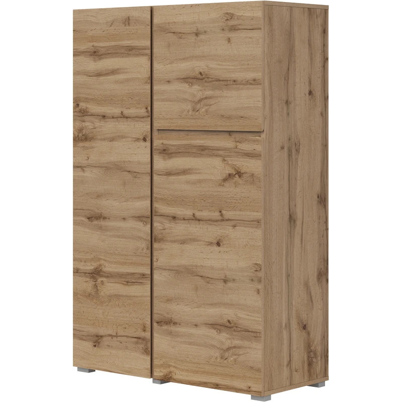 Wnętrze komody oferuje 4 praktyczne półki, które pomagają uporządkować różne kategorie rzeczy. Asymetryczny układ frontów przełamuje prostą formę i nadaje bryle nowoczesny wygląd. To wysoka komoda dąb wotan, która łączy wygodne przechowywanie, kompaktową szerokość i estetykę dopasowaną do współczesnych aranżacji.