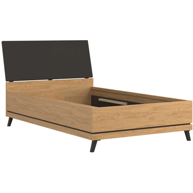 Konstrukcja łóżka została wykonana z płyty wiórowej laminowanej, o grubości 16 mm i 28 mm, w kolorze dąb kamienny z czarnymi akcentami, co nadaje meblowi nowoczesny i stylowy wygląd. Dodatkowo, nóżki w kolorze czarnym zapewniają stabilność i łatwość w utrzymaniu czystości.