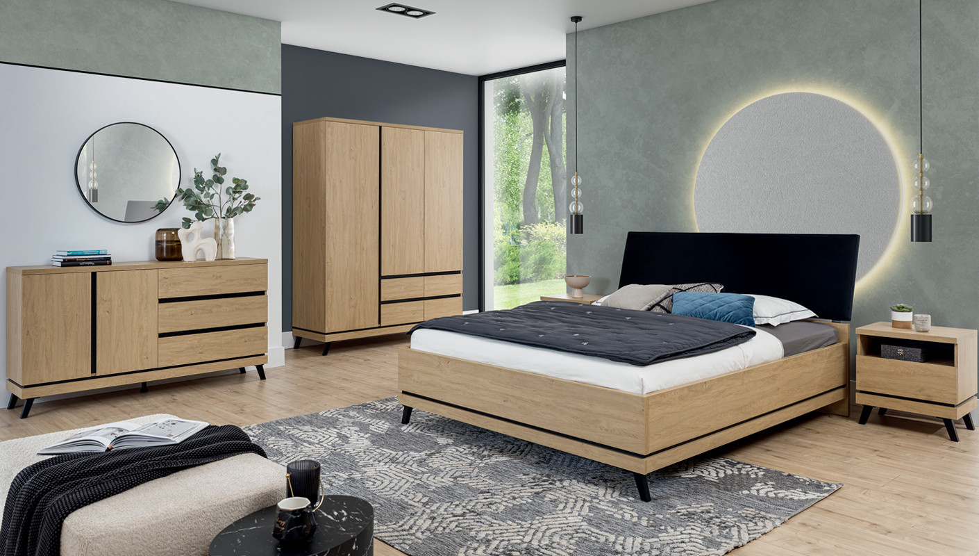 Konstrukcja łóżka została wykonana z płyty wiórowej laminowanej, o grubości 16 mm i 28 mm, w kolorze dąb kamienny z czarnymi akcentami, co nadaje meblowi nowoczesny i stylowy wygląd. Dodatkowo, nóżki w kolorze czarnym zapewniają stabilność i łatwość w utrzymaniu czystości.