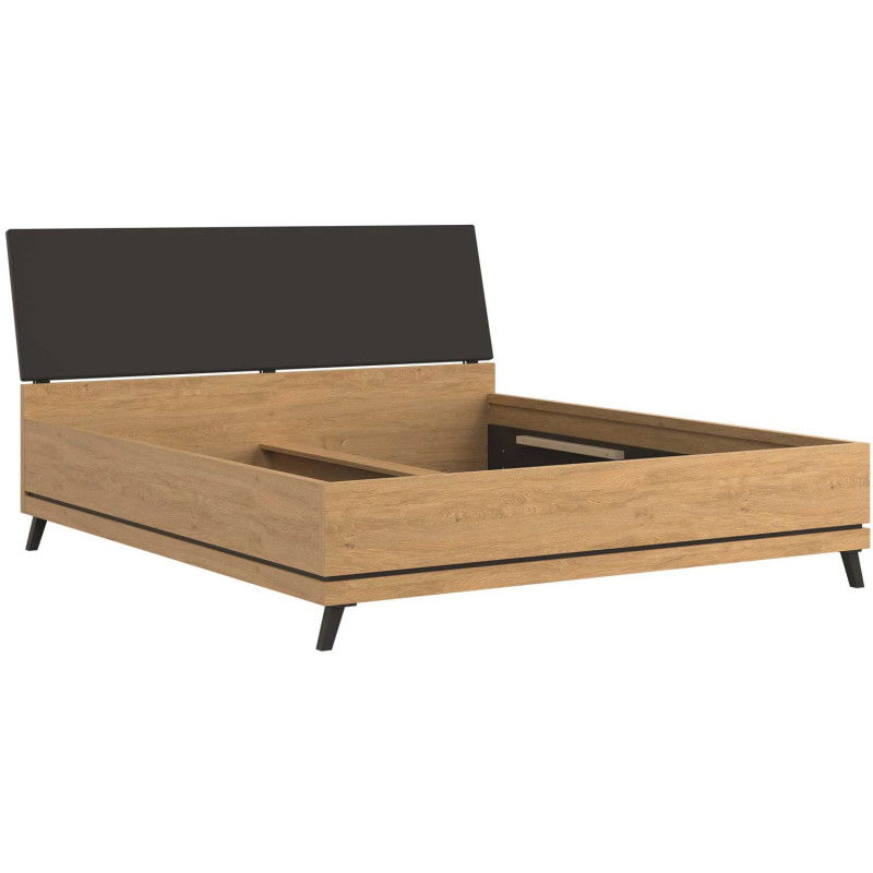 Konstrukcja łóżka została wykonana z płyty wiórowej laminowanej, o grubości 16 mm i 28 mm, w kolorze dąb kamienny z czarnymi akcentami, co nadaje meblowi nowoczesny i stylowy wygląd. Dodatkowo, nóżki w kolorze czarnym zapewniają stabilność i łatwość w utrzymaniu czystości.