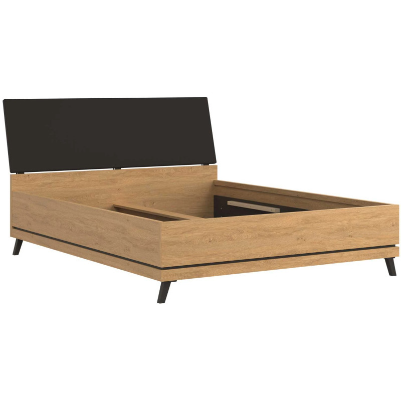 Konstrukcja łóżka została wykonana z płyty wiórowej laminowanej, o grubości 16 mm i 28 mm, w kolorze dąb kamienny z czarnymi akcentami, co nadaje meblowi nowoczesny i stylowy wygląd. Dodatkowo, nóżki w kolorze czarnym zapewniają stabilność i łatwość w utrzymaniu czystości.
