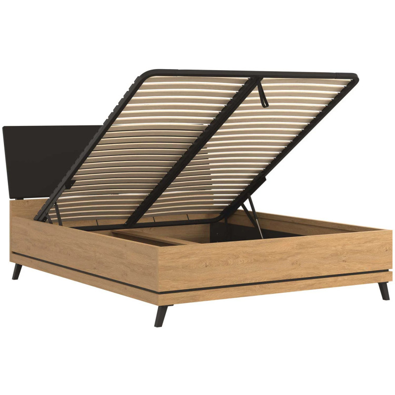 Konstrukcja łóżka została wykonana z płyty wiórowej laminowanej w kolorze dąb kamienny z czarnymi akcentami, co nadaje meblowi nowoczesny i stylowy wygląd. Dodatkowo, nóżki w kolorze czarnym zapewniają stabilność i łatwość w utrzymaniu czystości.