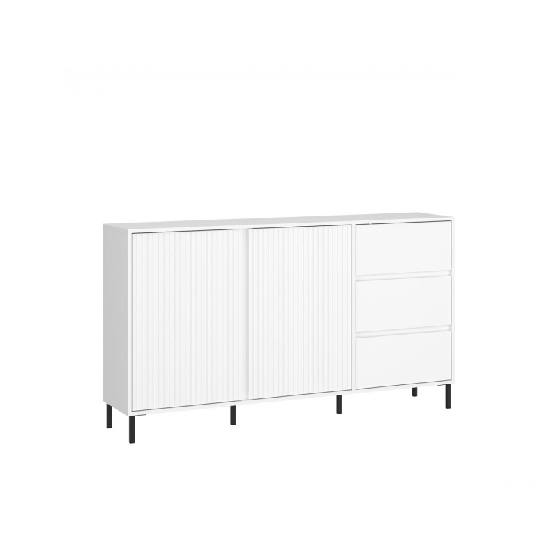Komoda AVENALE AVEK01 to propozycja dla miłośników nowoczesnego stylu i funkcjonalnych rozwiązań. Białe, ryflowane fronty w wysokim połysku odbijają światło, optycznie powiększając przestrzeń i nadając wnętrzu elegancji. Smukłe, czarne metalowe nóżki dodają lekkości formie, a minimalistyczna bryła bez uchwytów doskonale wpisuje się w estetykę współczesnych aranżacji. Komoda znakomicie sprawdzi się zarówno w salonie, jak i w przedpokoju czy jadalni.
