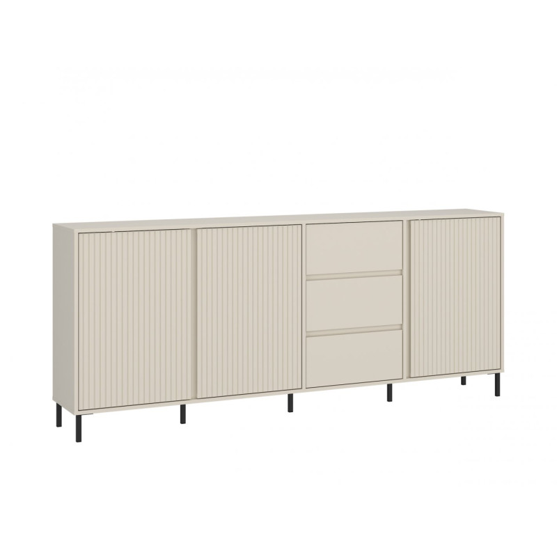 Model o szerokości 212 cm łączy minimalistyczny design z funkcjonalnością: za trzema drzwiami z cichym domykiem znajdują się pojemne półki na domowe tekstylia, dokumenty czy naczynia, a trzy głębokie szuflady na prowadnicach kulkowych z pełnym wysuwem ułatwiają szybki dostęp do potrzebnych rzeczy. Fronty wykonane z płyty MDF i płyty wiórowej laminowanej otwierają się za pomocą frezowanych wpuszczeń, co pozwala zachować spójną i czystą formę mebla.